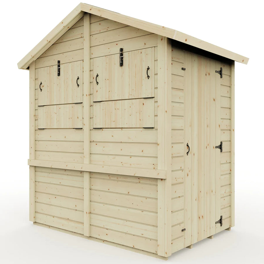 Introducing the Storehaus Bar Shed – an ideal addition to your garden for family gatherings or as a stylish pop-up bar at events. These versatile outdoor buildings feature 2 or 3 opening front hatches (depending on the size) that effortlessly fold down to create convenient bar tops for serving.