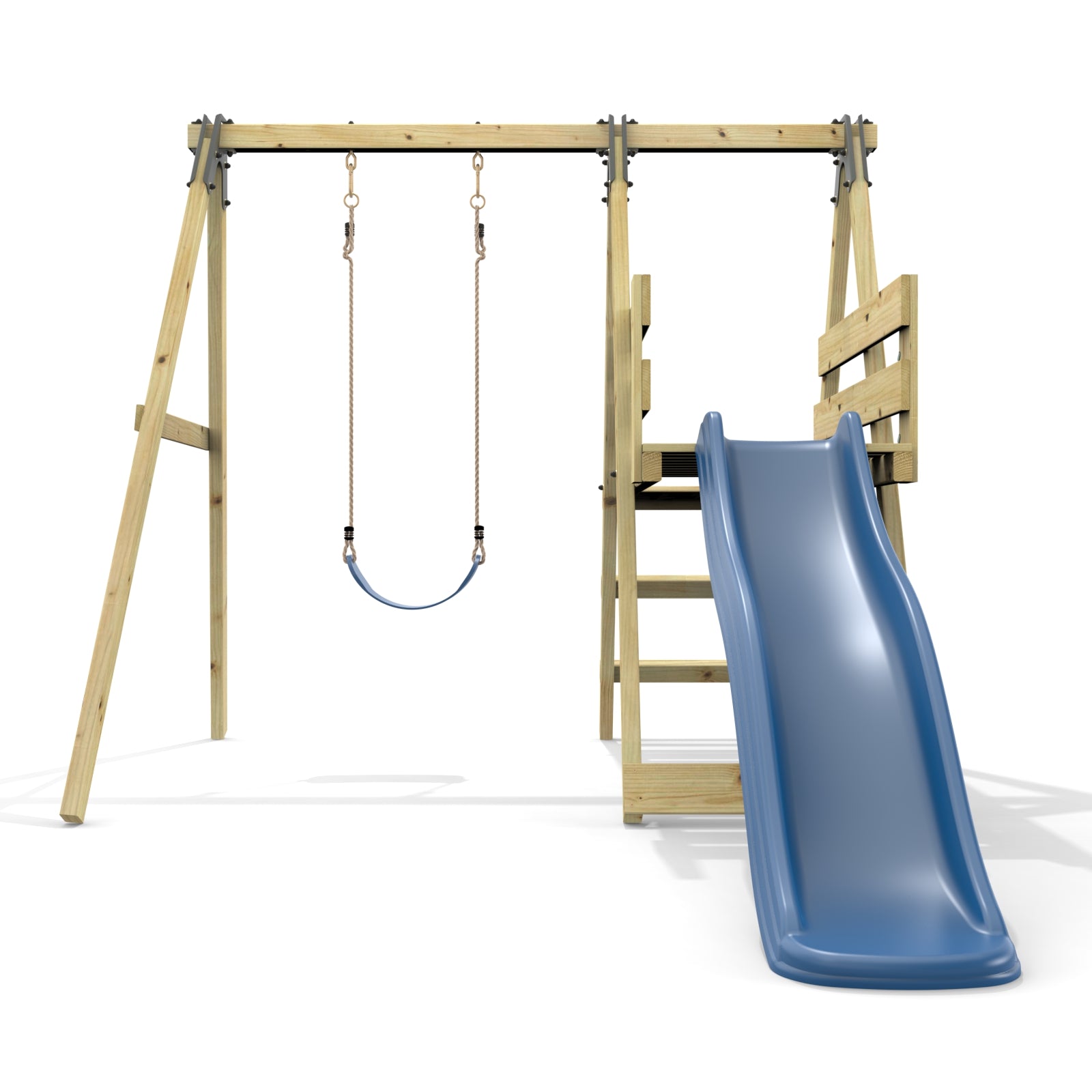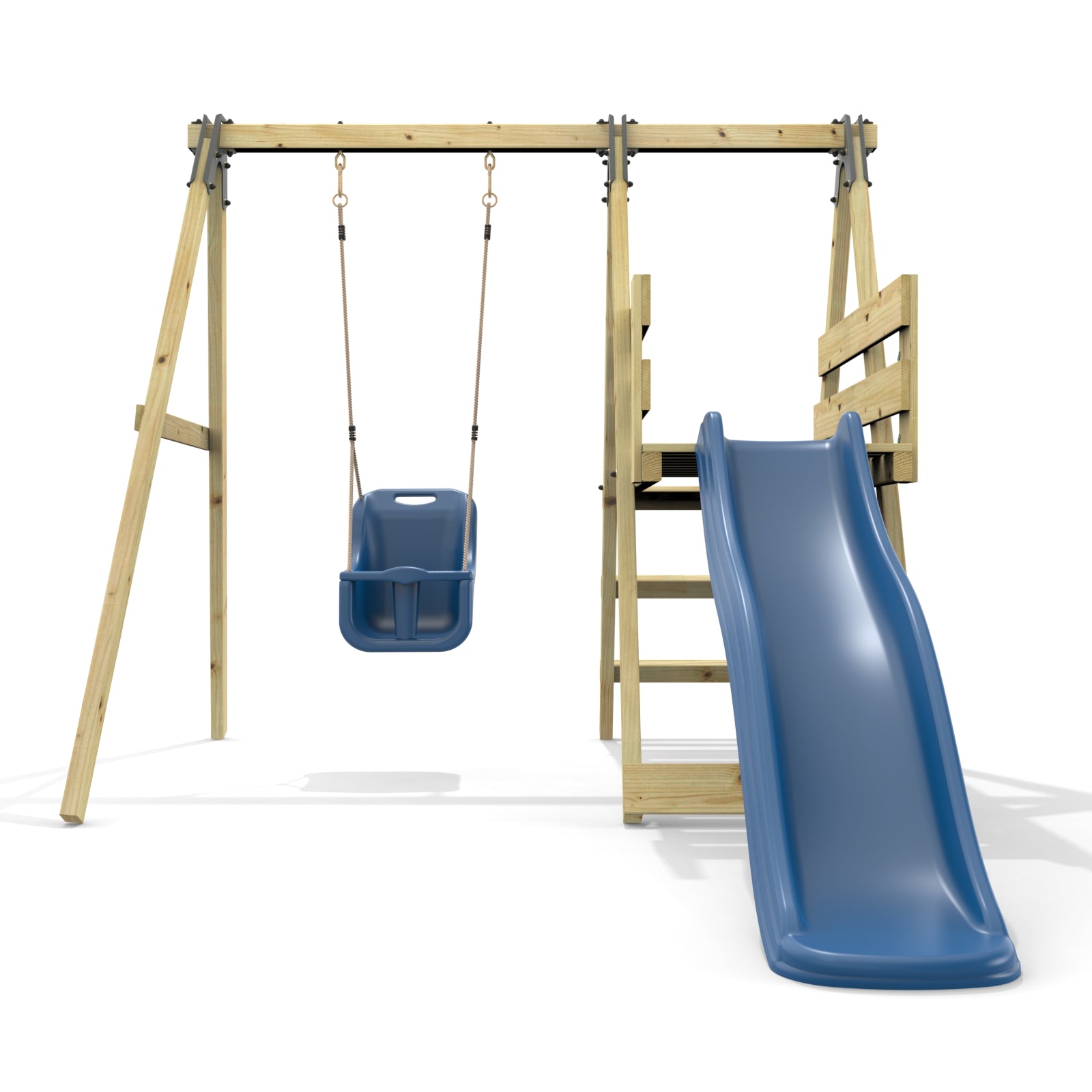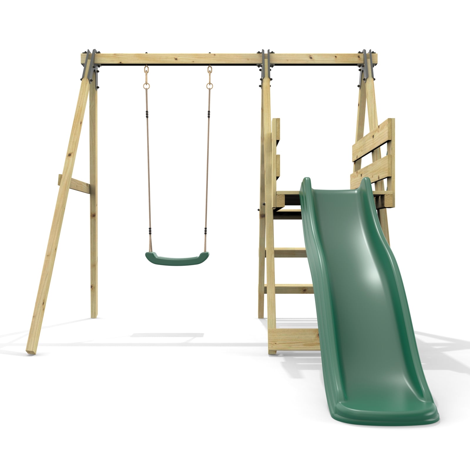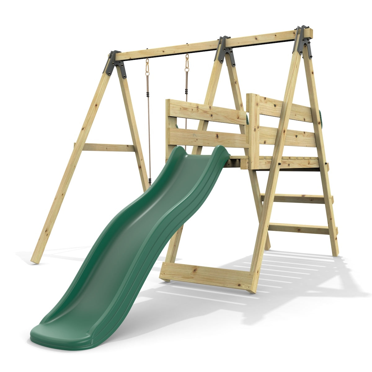 The new Orchid single swing with slide is a durable garden swing set made from strong pressure treated square profile timber, the compact footprint is styled to complement any outside space thanks to its elegant modern design.