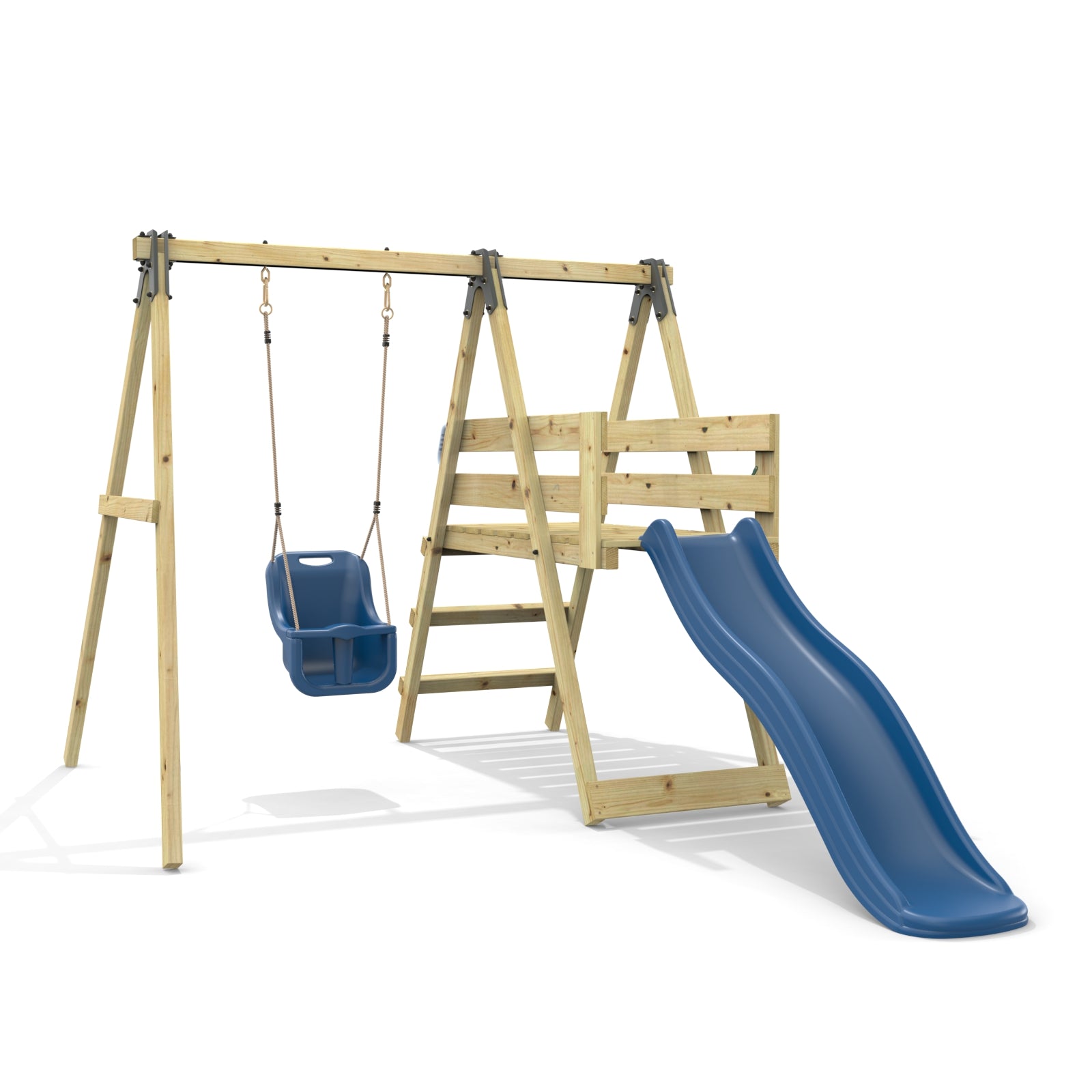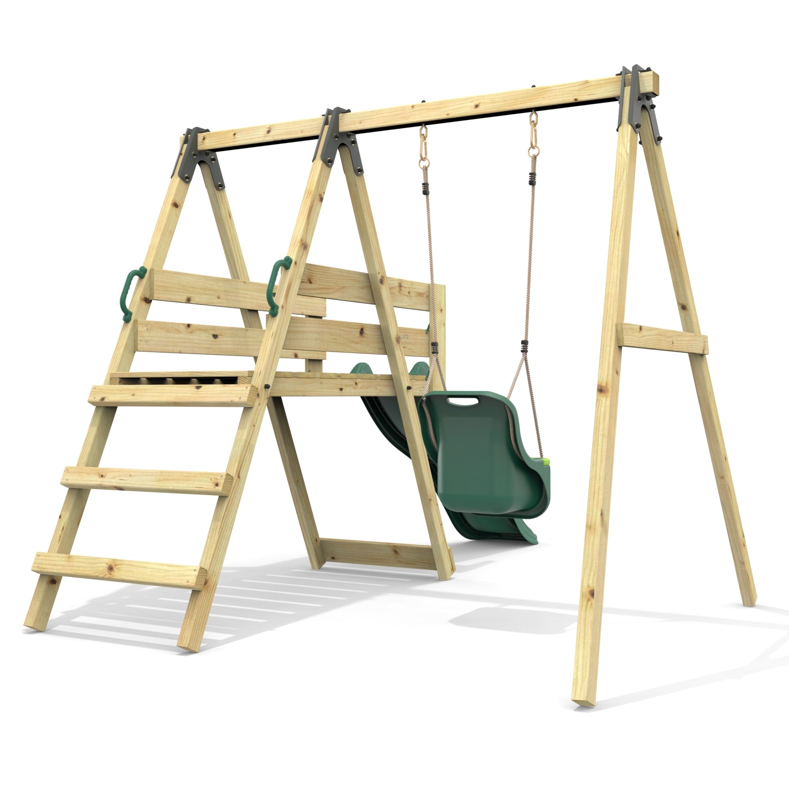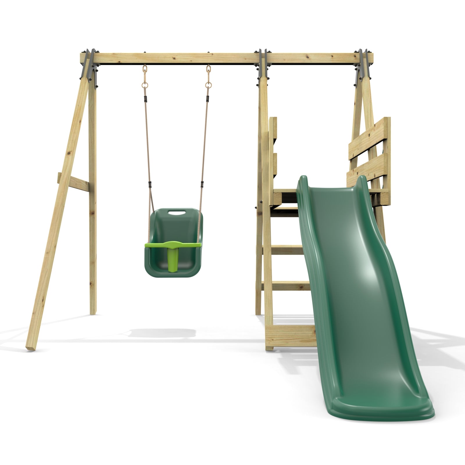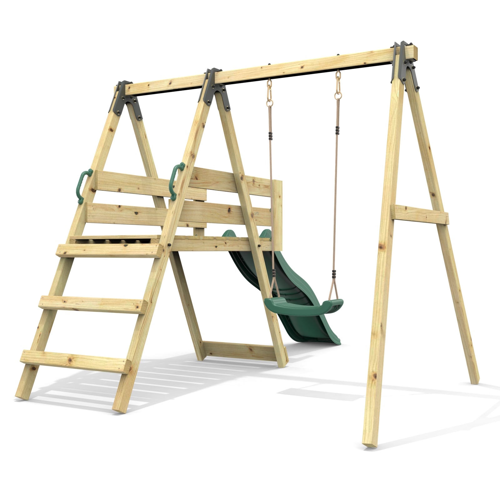 The new Orchid single swing with slide is a durable garden swing set made from strong pressure treated square profile timber, the compact footprint is styled to complement any outside space thanks to its elegant modern design.